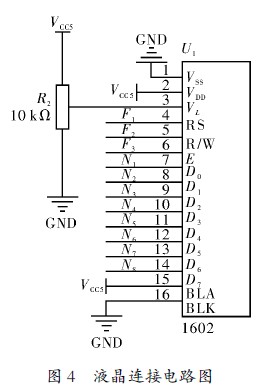 基于液晶1602顯示內(nèi)容豐富,功耗低等優(yōu)點(diǎn),選用液晶1602作為顯示模塊。液晶的第1管腳是接地管腳,管腳VCC接電源,液晶的管腳VL外接電源串聯(lián)一個(gè)10 kΩ的電位器后接地,用來調(diào)節(jié)液晶的亮度對比度,使其顯示清楚、準(zhǔn)確。管腳RS接單片機(jī)的P1.0口。管腳RW接單片機(jī)P1.1。管腳EN接單片機(jī)P1.2口,是液晶的使能管腳。液晶的數(shù)據(jù)口(7~14管腳)接單片機(jī)的P0.0~P0.7口,液晶的數(shù)據(jù)口采用8位并口方式進(jìn)行數(shù)據(jù)傳送。第15,16管腳是液晶背光燈的正負(fù)極,分別接VCC和GND即可。液晶連接電路圖如圖4所示。