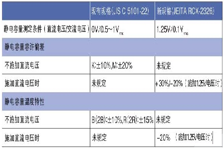 在靜電容量的測(cè)定上,新規(guī)格改為在施加1.25V直流電壓和0.1Vrms交流電壓的狀態(tài)下對(duì)容量進(jìn)行測(cè)定。而原來(lái)的“JIS C 5101-22”規(guī)格并不要求施加直流電壓,只是要求在施加0.5~1Vrms交流電壓的狀態(tài)下對(duì)容量進(jìn)行測(cè)定。
