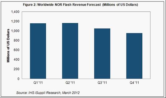 據(jù)IHS iSuppli公司的移動市場存儲報告,由于經(jīng)濟形勢糟糕和泰國洪災導致PC出貨量下降,2011年第四季度NOR閃存營業(yè)收入環(huán)比下降9%。