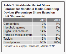據(jù)IHS iSuppli公司的消費平臺專題報告,憑借多種多樣的功能與特點,智能手機和平板電腦等多用產(chǎn)品將繼續(xù)侵蝕數(shù)碼相機等其它專用消費電子產(chǎn)品的銷售,最終在2015年導致這些傳統(tǒng)的媒體再現(xiàn)(media-rendering)設(shè)備市場永久衰落。