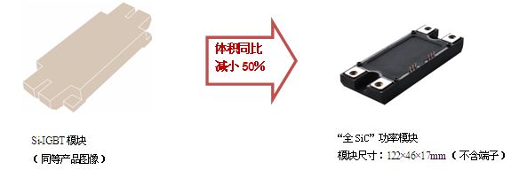不僅如此,通過設(shè)計(jì)和工藝的改善,羅姆還成功開發(fā)出散熱性卓越的模塊。替換傳統(tǒng)的400A級別的Si-IGBT模塊時,體積可減小約50%。由于損耗低,因此發(fā)熱少,可減小外置的冷卻裝置體積,從而非常有助于設(shè)備整體的小型化。