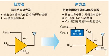使用DC-DC轉(zhuǎn)換器(功率放大器電源穩(wěn)壓器)的主要目的是減少分母中的Pdc因子。當功率放大器與電池直接相連時,Pdc=Vbatt*Ibatt,而當它使用功率放大器電源穩(wěn)壓器供電時,Pdc=V o*I o?,F(xiàn)在我們能夠看出,為了增加PAE,V o和Io 必須低于Vbatt和Ibatt。這可以通過降低發(fā)射的射頻功率電平,降低功率放大器電源穩(wěn)壓器的輸出電壓來實現(xiàn)。這樣也降低了Io (功率放大器的吸收電流),并且由于DC-DC轉(zhuǎn)換器的高效性,電池的輸出電流也會降低。