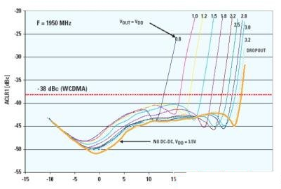如圖3所示,為了符合鄰道功率抑制比(ACPR)的要求,DC-DC轉(zhuǎn)換器的輸出電壓必須隨著發(fā)射功率電平的變化而變化。在0d Bm到20d Bm的功率電平范圍內(nèi),電池電流可節(jié)省多達50mA。圖2表示的是功率放大器在大多數(shù)時間內(nèi),運行在這樣的功率電平范圍內(nèi)。