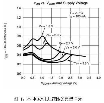 低導(dǎo)通電阻往往是模擬開關(guān)在音頻切換時的主要選擇因素。值得注意的是,導(dǎo)通電阻是針對具體的VCC、VIN(電壓輸入)及給定負(fù)載電流而指定的。在晶體管級,RON為器件長度(L)、器件寬度(W)、電子與空穴遷移率、氧化層電容、門限電壓及信號電壓的函數(shù)?! ?br />