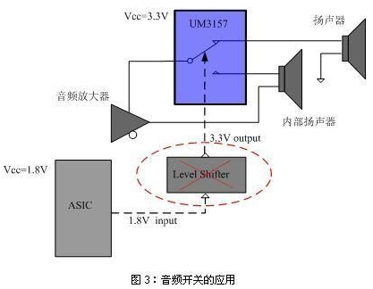 此外,英聯(lián)的低ICCT系列模擬開關(guān)具有更低的VIH電平值,可以使用較低的控制電平實(shí)現(xiàn)開關(guān)的高電平切換控制。產(chǎn)品的這種特性大大減少了系統(tǒng)工程師設(shè)計(jì)電路的復(fù)雜性,特別是在供電電源和控制信號電平不匹配的便攜產(chǎn)品應(yīng)用中可以免除使用電平轉(zhuǎn)換模塊,從而有效降低了成本。以模擬開關(guān)用來切換音頻信號為例,如圖3所示,可以使用ASIC傳輸過來的1.8V電壓直接來控制UM3157的控制管腳,而不必采用電平轉(zhuǎn)移器也能在實(shí)現(xiàn)開關(guān)切換的同時達(dá)到很小的漏電流。此外,由于低ICCT模擬開關(guān)不消耗很多功耗(大約1uA),且開關(guān)的導(dǎo)通電阻隨工作電壓的增加而降低,設(shè)計(jì)人員可以使用較高的供電電壓來達(dá)到更低的導(dǎo)通電阻。對于典型的音頻開關(guān)或USB應(yīng)用,低的導(dǎo)通電阻是非常重要的。