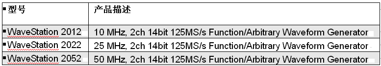 力科公司日前宣布發(fā)布WaveStationTM 系列函數(shù)/任意波形發(fā)生器。WaveStation最高信號(hào)生成頻率50MHz,提供3.5”大屏幕顯示,直觀的人機(jī)交互界面,全系標(biāo)配雙通道輸出和PC端波形編輯功能。WaveStation系列包含三款型號(hào),帶寬分別為10 MHz, 25 MHz和50 MHz;采樣率125MS/s,14-bit分辨率,每通道16Kpts存儲(chǔ)深度。WaveStation除擁有基本函數(shù)波形:正弦、方波、斜坡、脈沖和噪聲等信號(hào)之外,還內(nèi)置了超過40種任意波形函數(shù)庫(kù)。創(chuàng)新的3.5”彩色顯示屏方便將預(yù)覽波形和波形參數(shù)同時(shí)顯示,如頻率、幅值、偏置和相位等。WaveStation提供了多種調(diào)制模式:AM, PM, FM, ASK, PSK, FSK和PWM,可以通過前面板直接編輯。儀器提供了必需的I/O接口方便與其他設(shè)備同步,同時(shí)提供標(biāo)準(zhǔn)USB和GPIB接口用于遠(yuǎn)程控制和自動(dòng)化編程,WaveStation的發(fā)布定位于強(qiáng)大,靈活的波形生成能力。