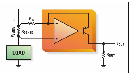 圖6:凌力爾特科技公司LTC6102可以直接實(shí)現(xiàn)高端電流檢測(cè)。配置該器件只需一個(gè)RSENSE和兩個(gè)增益電阻器。設(shè)計(jì)師可以通過(guò)選擇RIN和 ROUT來(lái)定制功耗、響應(yīng)時(shí)間以及輸入/輸出阻抗特性。[page]