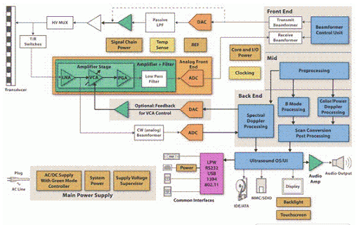 很明顯,在高端便攜式系統(tǒng)之間實現(xiàn)共享信號處理單元是非常困難的。但是,在不考慮不同性能要求的情況下,超聲波系統(tǒng)通常擁有相似的接收通道架構。