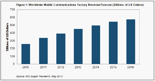 上述預測數據由無線通信產業(yè)各領域中的OEM廠商的總體工廠營業(yè)收入構成,包括手機、媒體平板和移動基礎設備等主要領域,以及無線路由器、無繩電話、電池充電器和灰市手機等輔助領域。