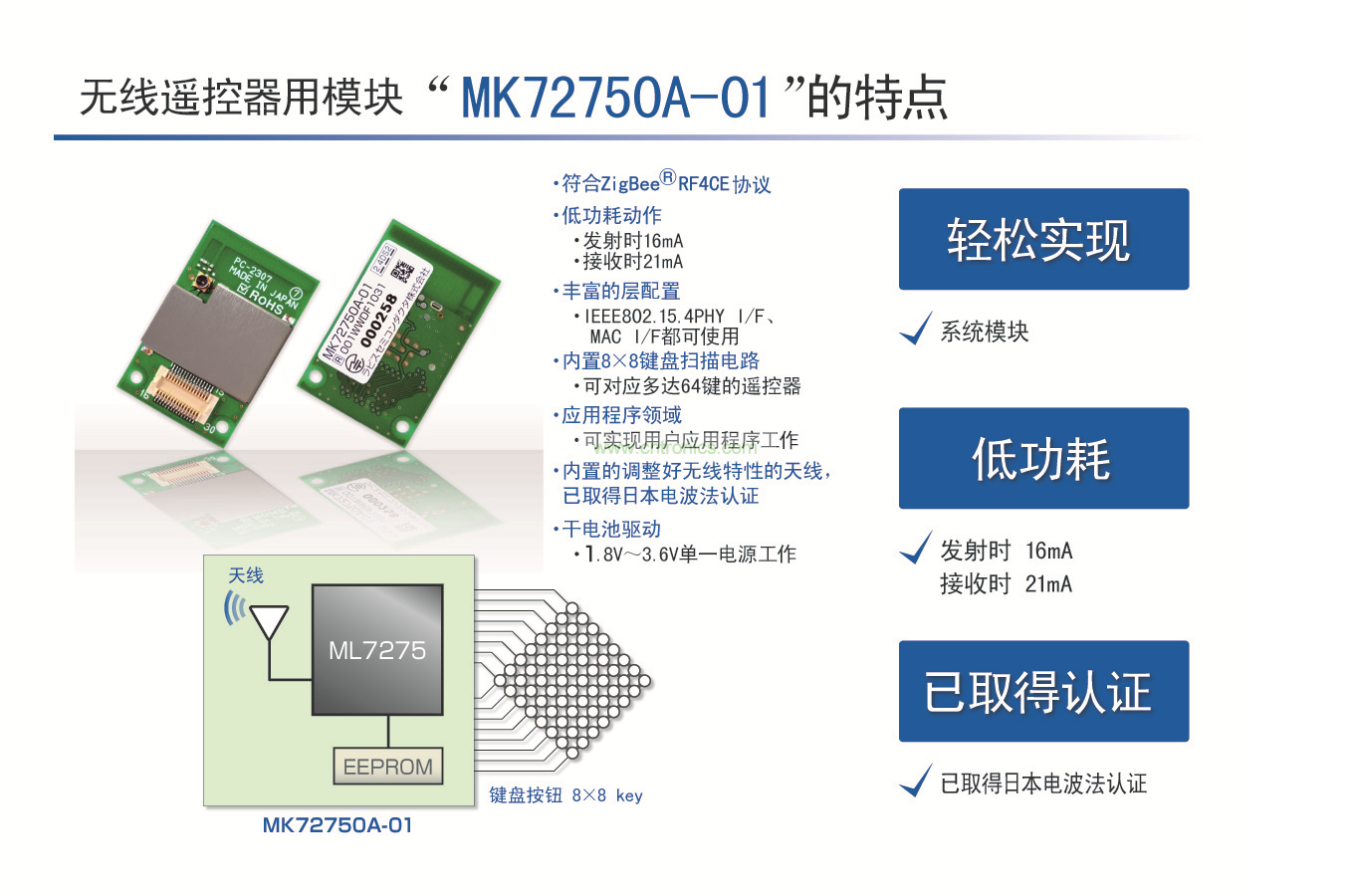 針對這種情況,LAPIS Semiconductor開發(fā)出2.4GHz無線通信模塊“MK72750A-01”,此模塊符合“ZigBee®RF4CE”協(xié)議,并且可通過內置的調整好無線特性的天線立即發(fā)射電波。另外,此模塊作為無線通信LSI,由于內置了本公司生產的“ML7275”,因此僅此模塊可以實現ML7275著稱的低功耗且符合RF4CE規(guī)范的無線遙控器功能。本產品內置調整好無線特性的天線,已取得日本國內電波法認證,所以,無線技術開發(fā)經驗較少的客戶也可開始輕松開發(fā)。在日本國內,可以立即發(fā)射電波進行評價、開發(fā),因而開發(fā)周期亦可大大縮短。另外,使用了本公司設計的無線通信LSI,LSI相關事項可提供迅速、精準的技術支持。