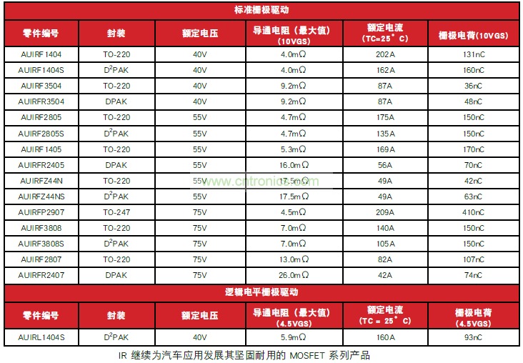 作為 IR 汽車質(zhì)量倡議的組成部分,IR 的汽車 MOSFET都通過了動(dòng)態(tài)和靜態(tài)部件平均測試和 100% 自動(dòng)化晶圓級(jí)目測檢查,旨在實(shí)現(xiàn)零缺陷。 IR的新型 AU材料清單表明在經(jīng)過 5,000 次溫度循環(huán)之后,導(dǎo)通電阻的最大變化不超過 10%,這超過了規(guī)定在經(jīng)過 1,000 次溫度循環(huán)的測試之后,導(dǎo)通電阻的變化不得超過 20% 的