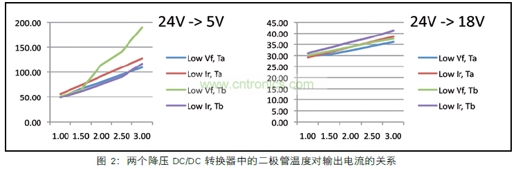 圖 2 還清楚地顯示輸入輸出電壓比。左圖顯示低占空比5 V輸出的D C / D C 轉(zhuǎn)換器。在較低的占空比時(shí),T2的時(shí)間較長(zhǎng),功耗也較高。這反過來使二極管更熱,使得Ir增加地更大,因此PT1變得更高。總的結(jié)果是:在輸出電流增加時(shí),二極管的溫度會(huì)很快地升高。在電流較高時(shí),溫度實(shí)際上已經(jīng)超過了二極管規(guī)定的工作范圍。在圖 2 的右側(cè),較高的輸出電壓18V時(shí),它的占空比也比較高,這使得PT2損耗保持在可控制范圍內(nèi)。二極管上產(chǎn)生的熱量較少,使得Ir增加的幅度較小,因此,PT1會(huì)更少,并且整體溫度升高幅度較小。