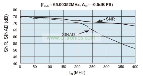 圖1:MAX12559在96MHz時鐘頻率、-1dBFS輸入時,SNR和SINAD與輸入頻率的對應(yīng)關(guān)系曲線。