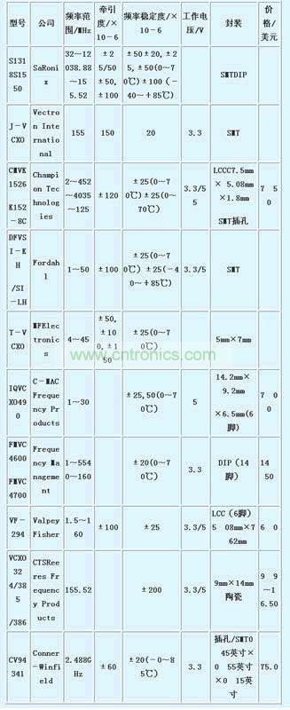 隨著現(xiàn)代無線通信系統(tǒng)向高頻、寬帶、便攜式方向發(fā)展,要求VCXO具有高頻、高性能、頻率范圍寬、線性度好、頻率穩(wěn)定度優(yōu)、頻率牽引誤差小、噪聲低和封裝尺寸小等特性。世界上各先進(jìn)國家競相開發(fā)與生產(chǎn)高水平的產(chǎn)品來滿足日益增長的市場需求。表1為美國十大著名VCXO廠商生產(chǎn)的VCXO品種、性能和價(jià)格1。