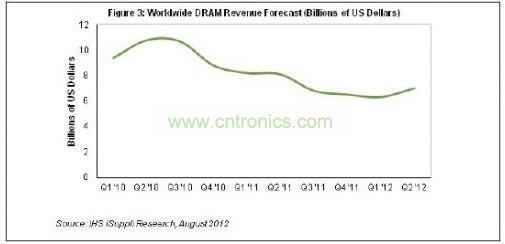 2012年第二季度DRAM營業(yè)收入為70億美元,比第一季度的63億美元勁增11%,如圖1所示。這是DRAM產(chǎn)業(yè)自2010年第二季度以來首次增長,上個季度的營業(yè)收入是四年來的第三低水平。廠商對下滑局面得到扭轉(zhuǎn)感到高興,盡管第二季度營業(yè)收入遠(yuǎn)低于2010年同期的90億-100億美元。