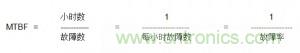 想要將一個(gè)部件的材料清單(BOM)與另一個(gè)部件的材料清單進(jìn)行比較會(huì)怎么樣呢?能不能將每個(gè)元件的MTBF簡(jiǎn)單地加在一起,來(lái)確定總體可靠性呢?可惜的是:不可以。這是因?yàn)镸TBF代表的是出現(xiàn)故障的小時(shí)數(shù),按照加法計(jì)算是不起作用的。然而,故障率,一個(gè)代表每小時(shí)發(fā)生故障的次數(shù),是可以相加。慶幸的是將MTBF轉(zhuǎn)換成故障率僅是一個(gè)很簡(jiǎn)單分?jǐn)?shù)關(guān)系。以下是公式: