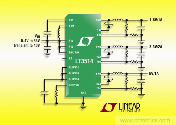 LT3514的開關(guān)頻率可由用戶編程在 250kHz 至 2.2MHz,且在整個頻率范圍內(nèi)是可同步的,從而使設(shè)計師能優(yōu)化效率,同時避開了關(guān)鍵的噪聲敏感頻段。其 28 引線 4mm x 5mm QFN 封裝和高開關(guān)頻率允許使用小型的外部電感器和電容器,可為多輸出應(yīng)用提供占板面積緊湊和熱效率很高的解決方案。