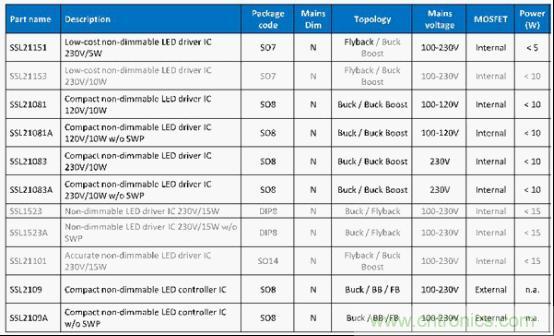 圖1 NXP中小功率市電供電非調(diào)光LED驅(qū)動IC選型表格