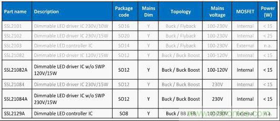 圖2 NXP中小功率市電供電可控硅調(diào)光LED驅(qū)動IC選型表格
