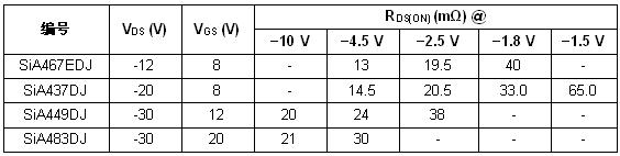 開關(guān),以及智能手機(jī)、平板電腦、移動(dòng)計(jì)算設(shè)備、硬盤驅(qū)動(dòng)器和固態(tài)驅(qū)動(dòng)的同步降壓轉(zhuǎn)換應(yīng)用里的控制開關(guān),-12 V SiA467EDJ提供了13m?(-4.5V)的極低導(dǎo)通電阻。-20V SiA437DJ的導(dǎo)通電阻為14.5m?(-4.5V),-30V SiA449DJ和SiA483DJ的導(dǎo)通電阻分別只有20m?(-10V)和21m?(-10V)。另外,SiA437DJ和SiA467EDJ的電流等級(jí)高達(dá)30A,承受很大的涌入電流,可用于負(fù)載開關(guān)。