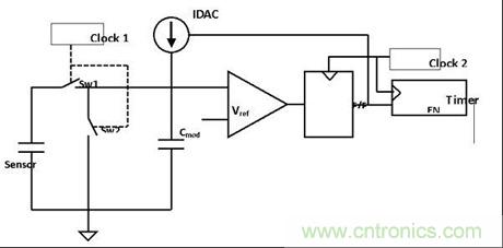 通過在GND和VREF(內部生成)之間切換傳感器,只要在器件規(guī)定的工作范圍內,電源的任何變化都不會造成假觸發(fā)。圖2顯示了傳感器電容在集成電容(Cmod)電壓和GND之間用兩個非重疊時鐘Sw1和Sw2切換時的技術實施情況。電路比較器的輸出通過觸發(fā)器作為定時器的使能信號,并通過調節(jié)電源來確保Cmod電壓與參考電壓(Vref)相同。由于輸入端上的任何信號都就n個時鐘周期求積分(n取決于分辨率),因此耦合到輸入端上的任何高頻噪聲都會通過積分效果被平均。