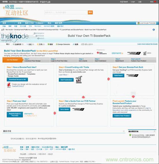 【導(dǎo)讀】e絡(luò)盟社區(qū)與TI攜手合作推出專(zhuān)屬網(wǎng)站平臺(tái)——全新BoosterPack擴(kuò)展板,無(wú)論是進(jìn)行產(chǎn)品設(shè)計(jì)、籌集資金、原型設(shè)計(jì)、產(chǎn)品制造還是產(chǎn)品推廣,開(kāi)發(fā)人員都可通過(guò)這個(gè)專(zhuān)屬網(wǎng)站與行業(yè)領(lǐng)先合作伙伴進(jìn)行溝通合作。
