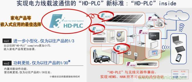 “HD-PLC”inside是最適合利用已有電力線的、作為高速電力線載波通信方式之一而備受矚目的“HD-PLC”的嵌入的標(biāo)準(zhǔn),該標(biāo)準(zhǔn)通過(guò)嵌入白色家電、HEMS、BEMS以及HAN相關(guān)設(shè)備等,可將電力線作為通信網(wǎng)絡(luò)使用。新標(biāo)準(zhǔn)產(chǎn)品搭載了間歇?jiǎng)幼鞴δ?,與以往的PLC產(chǎn)品相比,可進(jìn)一步大幅降低功耗。