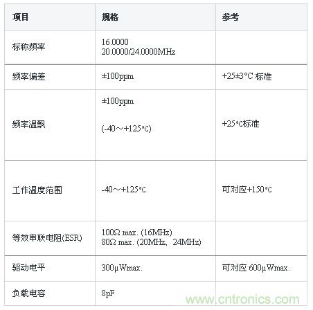 車載HCR®「XRCHA-F-A」系列的產(chǎn)品外觀如圖1所示,產(chǎn)品規(guī)格如圖2所示。車載用晶體時(shí)鐘的需求很多,從16MHz到24MHz都有相應(yīng)產(chǎn)品。采用的尺寸是2.5×2.0mm,和同一頻帶的傳統(tǒng)晶體相比體積減少了37%。此外,原來(lái)的晶振使用的是玻璃密封和熔接的是密封性的封裝,HCR®如上所述,是在平板上用金屬帽這種簡(jiǎn)單的構(gòu)造,既經(jīng)濟(jì)又同時(shí)實(shí)現(xiàn)了高品質(zhì)的晶振。主要面向ECU、ABS、EPS、車身ECU等,標(biāo)準(zhǔn)的高精度化車載ECU的應(yīng)用。工作溫度范圍是-40~+125℃,但是也可以被應(yīng)用在+150℃的環(huán)境。