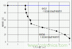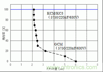 根據(jù)這個(gè)評價(jià)結(jié)果,于一般用2端子的MLCC(GCM系列)的殘存率的比較如圖7、圖8所示。GCJ、KCM/KC3系列,電路板的偏轉(zhuǎn)量在6mm的時(shí)候也看不見對陶瓷部分的破壞,于GCM系列相比耐電路板彎曲性有了飛速的改善。
