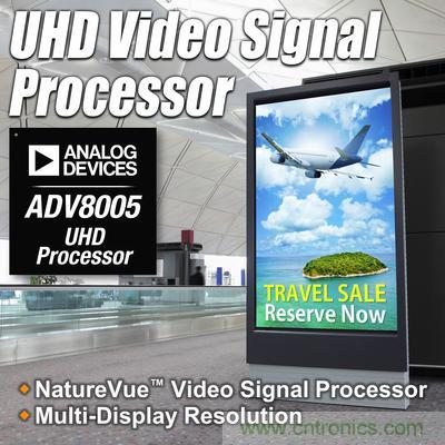 【導讀】Analog最近新出一款超高清(UHD)視頻信號處理器,這款處理器可以在SD 、ED 、HD以及UHD等視頻格式之間進行上下轉換。UHD NatureVue™ ADV8005視頻信號處理器,可為兩個同步視頻流提供多種屏幕分辨率,適用范圍十分廣泛。