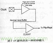采用這種輸入電路后,由于常規(guī)I/O是三態(tài)的,因此用戶不必?fù)?dān)心時(shí)鐘進(jìn)入器件。當(dāng)然,增加一級門電路會產(chǎn)生0.6ns的較大時(shí)鐘延時(shí),幸好這在多數(shù)低功率設(shè)計(jì)中是可以接受的。注意應(yīng)將與CLKINT緩沖器相關(guān)的CLKA或CLKB引腳接地。