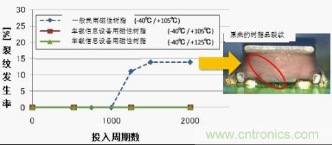 熱沖擊試驗投入的循環(huán)數(shù)和開裂發(fā)生率的關(guān)系如圖3所示??梢缘弥?,與面向一般民用市場的磁性樹脂在1000次循環(huán)試驗以內(nèi)會發(fā)生開裂相比,我們開發(fā)出的用于車載信息設(shè)備的磁性樹脂在2000次循環(huán)之后仍未發(fā)生開裂現(xiàn)象。并且,已經(jīng)確認(rèn)在更為嚴(yán)酷的環(huán)境下---40℃↔+125℃中進(jìn)行的熱沖擊試驗也沒有發(fā)生開裂現(xiàn)象。