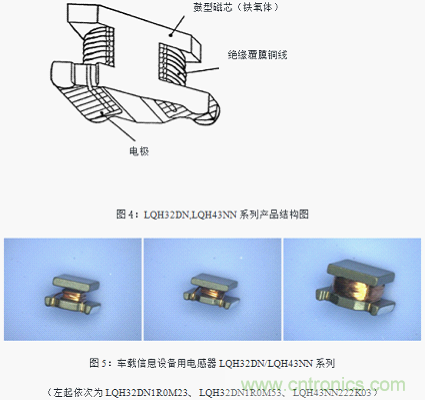 LQH32DN、LQH43NN系列是為了適應(yīng)大電感值領(lǐng)域的車載電感市場的需求所設(shè)計的,它的最高使用環(huán)境溫度可達(dá)105℃,是一種無磁性樹脂型的繞線電感器。為了降低由于鼓型磁芯開裂及絕緣覆膜銅線的熱膨脹收縮引起的斷線風(fēng)險,因而采用了無樹脂結(jié)構(gòu)。結(jié)構(gòu)概略圖如圖4,產(chǎn)品照片如圖5所示。