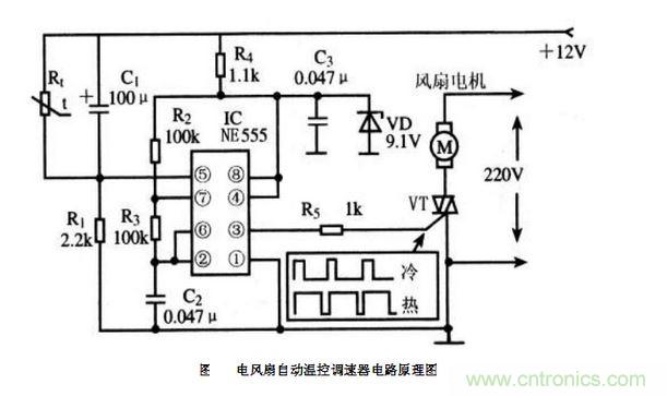電路工作原理:圖中IC是555時基電路,與R2、R3和C2等元件構成多諧振蕩器,可發(fā)出占空比可調的矩形波信號。當溫度變化時,熱敏電阻的阻值發(fā)生變化,改變多諧振蕩器輸出方波的占空比,調節(jié)雙向晶閘管VT的導通角,從而改變風扇電極兩端的電壓,自動調節(jié)電風扇的轉速。元器件選擇 集成電路IC選用NE555時基電路,也可使用LM555和TLC555等型號。VT為雙向晶閘管,其耐壓應在400V以上,額定電流應根據所控制的電風扇容量來合理選用。電阻R1~R5可選用普通1/8或1/4W碳膜電阻器;Rt為負溫度系數熱敏電阻,可選常溫下阻值為10KΩ左右的熱敏電阻。電容C1選用普通鋁電解電容器;電容C2和C3選用滌綸電容器。VD為穩(wěn)壓值為9.1V的穩(wěn)壓二極管。