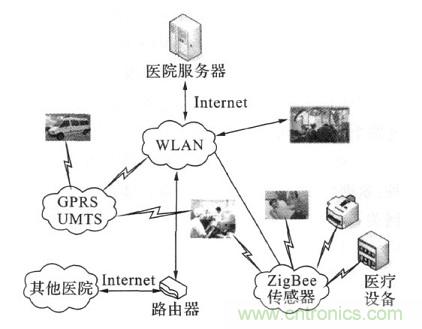 系統(tǒng)中包括無線個(gè)人網(wǎng)絡(luò)(wireless person2al area network,WPAN ) 、ZigBee網(wǎng)絡(luò)以及一系列醫(yī)療監(jiān)護(hù)網(wǎng)絡(luò)的醫(yī)療傳感器節(jié)點(diǎn)。本系統(tǒng)具有良好的擴(kuò)展性,例如醫(yī)護(hù)人員在急救途中或在其他醫(yī)院可以分別利用WLAN /UMTS網(wǎng)關(guān)和互聯(lián)網(wǎng)與系統(tǒng)進(jìn)行信息交互。