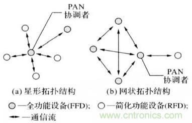 星形網(wǎng)絡(luò)結(jié)構(gòu)的通信是以FFD作為PAN協(xié)調(diào)者完成與設(shè)備之間的通信,在該網(wǎng)絡(luò)中PAN協(xié)調(diào)者的功能是初始化網(wǎng)絡(luò)、中止和路由信息。星形網(wǎng)絡(luò)廣泛應(yīng)用于自動(dòng)化家居、個(gè)人醫(yī)療監(jiān)護(hù)系統(tǒng)和醫(yī)院病房等小區(qū)域。