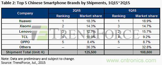 【導(dǎo)讀】近日,市場(chǎng)研究機(jī)構(gòu)TrendForce發(fā)布2015年度第二季度全球智能手機(jī)報(bào)告。中國(guó)的華為明顯獨(dú)領(lǐng)風(fēng)騷。數(shù)據(jù)顯示,三星雖然從蘋(píng)果手里奪回第一的寶座,但是,Q1和Q2 幾乎毫無(wú)變化。蘋(píng)果的市場(chǎng)份額則一調(diào)再掉,從Q1的20.5%掉到Q2的15.4%。華為的市場(chǎng)份額增加了7%,小米的份額增加了5%。