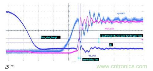 測(cè)試的目的是看上MOS管導(dǎo)通時(shí),有沒有同時(shí)把下管打開,從而導(dǎo)致電源直接導(dǎo)通到地而引起短路。如圖三所示藍(lán)色曲線(Vgs_Lmos)就是下管在上管導(dǎo)通的同時(shí),被帶了起來(lái),如果藍(lán)色曲線的被帶起來(lái)的尖峰超過(guò)了MOS管的Vth要求,同時(shí)持續(xù)時(shí)間(Duration)也超過(guò)了datasheet要求,從而就會(huì)有同時(shí)導(dǎo)通的風(fēng)險(xiǎn)。當(dāng)然,這是大家最常見到的情況。
