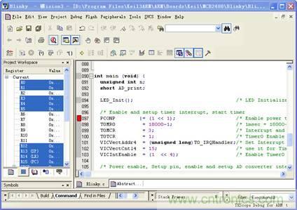 在程序窗口(包括C語言、匯編和反匯編窗口)中, 用鼠標雙擊需要設置斷點的程序行,則在窗口左邊的狀態(tài)條中出現(xiàn)紅色的斷點標志如圖2所示,完成設置斷點操作。再次用鼠標雙擊該程序行,窗口左邊的紅色斷點標志消失,則為刪除斷點操作。
