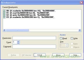 具體定義方法:在Expression內(nèi)輸入變量的地址,然后選擇讀寫屬性,并正確設置字節(jié)范圍,最后點擊Define即可。例如,在地址0x20004000開始,16字節(jié)范圍內(nèi),定義讀寫斷點操作,具體設置方法如圖4所示。