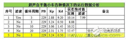 誤差絕對值是指小車在一段時間內(nèi),實(shí)測距離與設(shè)定平衡點(diǎn)距離誤差絕對值的平均值;濾波是指程序中對超聲波測量的距離濾波或不濾波直接使用;循環(huán)周期是程序中的延時時間,超聲波測量需要大約704us,一個周期大約為3.84ms,程序處理時間大約為136us.