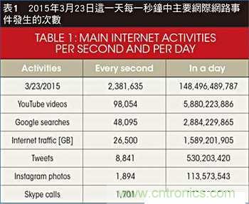 網(wǎng)際網(wǎng)路實(shí)現(xiàn)了廣泛的資料通訊服務(wù),如電子郵件、視訊下載、Google搜索、推特(Twitter)消息發(fā)送、Skype電話等等。表1列出了每天和每一秒鐘的主要網(wǎng)際網(wǎng)路活動(dòng)數(shù)量。