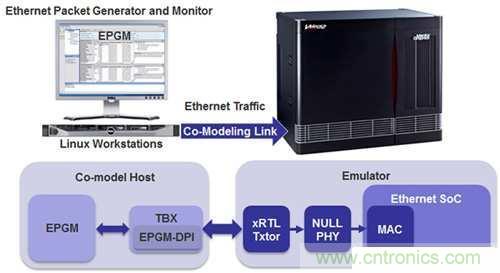 將這種設(shè)置與采用虛擬方法的設(shè)置進(jìn)行比較,如明導(dǎo)國(guó)際(Mentor Graphics)的虛擬乙太網(wǎng)設(shè)備(VirtuaLAB)。在此場(chǎng)景中,裝有Linux環(huán)境的工作站連接硬體加速器,在工作站上用軟體對(duì)乙太網(wǎng)測(cè)試儀實(shí)現(xiàn)一樣的行為模式?;诔墒斓膶?shí)現(xiàn)智慧財(cái)產(chǎn)權(quán)(IP),模型準(zhǔn)確再現(xiàn)了實(shí)際的物理測(cè)試儀。
