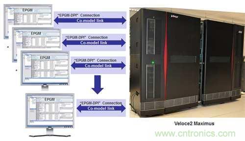 VirtuaLAB可為每個(gè)工作站提供32GMII、XGMII、XLGMII/CGMII和CXGMII埠。多個(gè)工作站的多個(gè)VirtuaLAB應(yīng)用可以結(jié)合在一起,即實(shí)現(xiàn)多個(gè)傳輸通道,可支援多埠數(shù)所需配置。采用高速鏈路(HSL)卡將各個(gè)工作站的協(xié)同模型(Co-model)連接到模擬器中。緊密集成的傳輸機(jī)制已準(zhǔn)備就緒,設(shè)計(jì)時(shí)鐘性能已調(diào)節(jié)至最佳化,并且它對(duì)測(cè)試平臺(tái)來(lái)說(shuō)是透明的。由于采用并行運(yùn)行時(shí)和調(diào)試架構(gòu),資料流(Data-plane)硬體模擬流量會(huì)隨埠數(shù)呈線性增長(zhǎng)。圖4為多個(gè)協(xié)同模型拓?fù)涞募軜?gòu)圖。