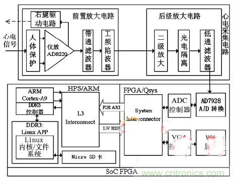 【導(dǎo)讀】本設(shè)計(jì)實(shí)現(xiàn)了一種基于片上系統(tǒng)現(xiàn)場可編程門陣列(SoC FPGA) 的心電信號(hào)(ECG)檢測系統(tǒng)。系統(tǒng)通過具有高輸入阻抗、高共模抑制比和低噪聲的前置采集放大電路,實(shí)現(xiàn)心電信號(hào)的拾取和預(yù)處理。