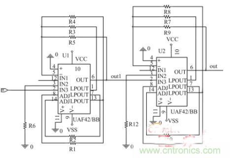 采集電路拾取的心電信號(hào)中有低頻的基線漂移和高頻干擾,還有在心電信號(hào)頻率范圍內(nèi)的50 Hz 工頻干擾,這些噪聲對心電信號(hào)提取的影響非常大。設(shè)計(jì)了基于通用有源濾波模塊UAF42 的帶通