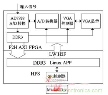數(shù)字系統(tǒng)包括A/D 轉(zhuǎn)換模塊、VGA 顯示模塊、數(shù)據(jù)存儲(chǔ)模塊和算法處理模塊。SoC FPGA 中的HPS 和其它的硬件模塊可以通過Qsys 進(jìn)行配置,用Quartus II 進(jìn)行硬件設(shè)計(jì),Qsys 和Quartus II 編譯可以產(chǎn)生軟件設(shè)計(jì)所需的信息文件。移植嵌入式Linux 系統(tǒng),下載sof 文件,用DS—5 進(jìn)行基于Linux 的系統(tǒng)軟件工程開發(fā)。