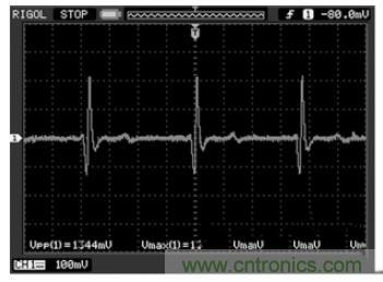 受測者佩戴心電電極,用醫(yī)用導(dǎo)聯(lián)線接入到模擬前端采集電路,后端接入示波器,待信號(hào)穩(wěn)定后就可以在示波器上觀測到心電信號(hào)波形,圖5 即為模擬前端電路實(shí)際測試波形圖。