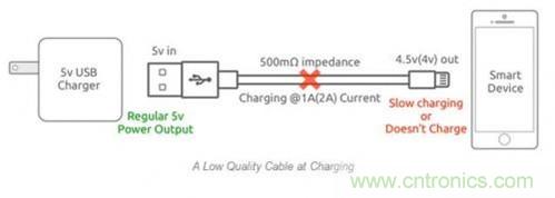 還拿上面那個例子來解釋,在2A充電電流下,會產(chǎn)生1V的電壓降,設備端充電電壓僅為4V。除了可能會帶來安全性問題之外,對智能設備而言,這么低的電壓甚至無法對設備充電。