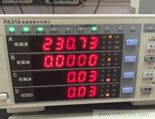 首先,可以從第一張圖中看到,PA310的“最大保持”指示燈亮著,此時打開了最大保持功能,也就是說儀器上顯示的數(shù)據(jù)是最大值,而不是實時數(shù)據(jù)。其次在第二排電流顯示窗口,沒有看到電流值,而在第三排功率顯示窗口中卻有功率數(shù)據(jù),由此可知電流量程選擇太大,這樣會給測量帶入更大的量程誤差。